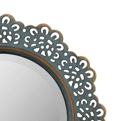 Stonebriar’s decorative round metal lace wall mirror is the perfect addition to your home décor. Mirror features a beveled glass mirror with crystal clear reflection accented by a turquoise metal lace frame with brass highlights. This unique accent mirror measures 12.5 inches in total diameter and the glass mirror alone measures 8 inches in diameter. Elegant mirror is perfect for the living room, bathroom, bedroom, hallway, or kitchen and will brighten up any home décor. Mirror comes with an attached metal loop hanger and is easily hung with a wall hook or screw (Hardware not included).