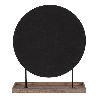 Create a centerpiece that makes a bold impression with the gorgeous Maxfield table mirror. The Kate and Laurel Maxfield tabletop mirror take inspiration from midcentury modern design to create a beautiful accent piece for your home. It features a trendy, circular mirror elevated by a sleek metal frame attached to a solid wood base. The Maxfield is handcrafted in India by skilled artisans, making each piece in the collection distinct in woodgrain and finish. The two-tone black and refined natural wood finish capture a chic, midcentury aesthetic that draws the eye and brings your decor together. The Maxfield’s overall dimensions are 18 inches wide by 6 inches deep by 22 inches tall, making it a staggering statement on a vanity, console table, dresser, or dining room table. The wood base adds an extra dimension of functionality to the mirror, providing a surface to quickly stash jewelry, makeup powder, keys, and more. This tabletop mirror has an easy assembly process, with only 2 steps separating you from this modern statement piece’s full beauty.