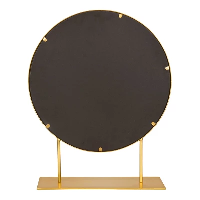 The Rouen mirror will make any desk like surface an instant vanity area for your morning or nighttime regime. Use as an accent for any room, whether you are looking for a mirror for your makeup area, bathroom or powder room, or decor for your dining room, living room, entryway console table or office. The frame and stand is constructed of all metal material and stands 22-inches high with an 18-inch diameter mirror. The base is 6-inches deep.