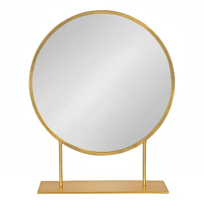 - The contemporary circular shape is supported by a sturdy base with a tabletop display dimension of 22 inches tall with 18-inch diameter mirror. Large enough to use for makeup application or as an extra bathroom mirror but small enough to be super convenient