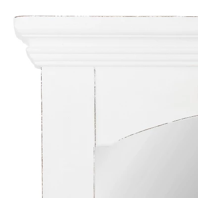 Create a home that indulges in a rustic farmhouse look with the Helcomb wall mirror by Kate and Laurel. Inspired by antique decor, this vintage mirror has a distressed white finish to bring out its weathered, resilient solid wood frame. The wooden frame has a subtle crowning both at the top and bottom, taking inspiration from decades of stylish, decadent construction. The mirror itself has a delicate arched top for a lovely, graceful look. The overall dimensions of the rustic Helcomb wall mirror are 20 inches wide by 28.75 inches tall, creating a robust statement piece for any room. Decorate any farmhouse-inspired living room, bedroom, entryway, dining room, or kitchen with this eye-catching focal point. Thanks to the large, 14.5 inches wide by 22 inches high surface area, this rustic wall mirror makes a great bathroom mirror over your powder room or master bathroom sink. Hang this sophisticated, antique-inspired wall mirror in only a matter of seconds with convenient metal D-ring hangers attached to the back of the Helcomb’s wooden frame.