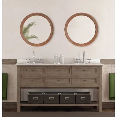 Create a boho-chic wall display in your home with the transitional, contemporary style of the Hartman round wall mirror from Kate and Laurel. Both effortless and modern, this mirror features a trendy round shape with a warm, brown wood-finished frame. The frame has solid rubberwood construction for a beautiful look that will last for years to come. Adding a mirror to your home opens up your space by spreading more light, creating a dimensional, open concept. This transitional wall mirror is great for a warm statement piece in your living room or entryway or as a boho-chic vanity in your master bedroom or bathroom. The Hartman mirror’s 24″ diameter size makes it excellent on its own or in multiples for a complete display or double vanity. Installation only takes a matter of seconds thanks to the sturdy metal D-ring hangers securely attached to the back. This modern accent is a perfect way to revamp any space in your home with a timeless bohemian statement that will last for generations to come.