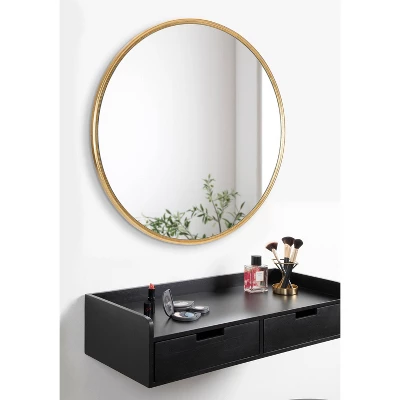 Create a decorative-yet-functional wall display with this trendy round mirror from Kate and Laurel. The Caskill mirror provides your home with plenty of light and dimension, standing at 24 inches tall by 24 inches wide for a chic, contemporary wall accent. Adding a mirror to your traditional wall decor allows your smaller spaces to appear larger, reflecting and spreading light throughout the area. The Caskill round mirror offers homeowners a chic look, featuring a refined, glam gold finish on its slim, minimalist profile. It looks excellent in any room: feature the Caskill above a bathroom vanity, over a console in your entryway, or above the mantle in the living room. It even looks beautiful as a secondary accent to your headboard in the master bedroom. Regardless of where and how you decide to use the Caskill round mirror, it offers a minimalist aesthetic with plenty of convenience. This mirror hangs in a matter of seconds with metal D-ring hangers secured to the back, making your new wall accent ready to use right out of the box.