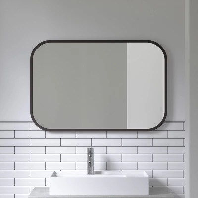 Hub Mirror Rectangular brings a fun and new shape to the classic Hub Mirror Family. Measuring 36 x 24 inches, Hub will not only brighten your space but adds visual depth to make it appear larger. With its modern black rubber rim that doubles as a protective bumper, this decorative mirror makes a perfect statement piece in any room.