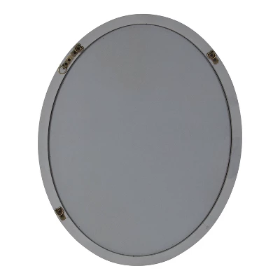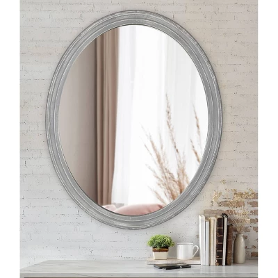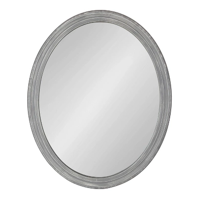 Make a bold and sophisticated statement on your wall with the transitional style of the Mansell decorative wall mirror. The oval-shaped glass mirror is bordered by a well-built, ornamental wooden frame that has a vintage, distressed look. Its distressed gray finish features a sloped transitional style and is made of durable, textured wood. Hang this lovely statement piece proudly over your vanity, dresser, shelf, or hang it as an accent piece in the living room, dining room, family room, or bedroom. The shape will be a great way to break up the straight lines of a gallery display or just the right size for smaller wall space. No matter the setting, it is sure to add a warm, charming visual appeal to your favorite living spaces. The outside dimensions of this oval mirror is 24 inches wide by 30 inches tall. To keep your installation simple, the Mansell wall mirror features metal D-ring hangers securely attached to the back of the wooden frame.