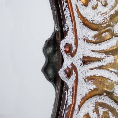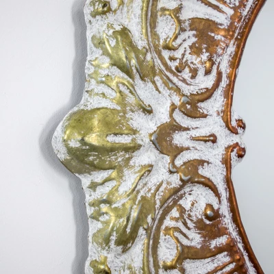 Add beauty to your home decor with this Decorative Metal Wall Mirror from E2 Concepts. Crafted from sturdy metal in a colorful distressed finish, this decorative wall hanging showcases a round mirror set inside an intricately embossed frame for visual interest. This round metal wall mirror can be mounted easily on any wall in your home. Perfect for a rustic or traditional space, this decorative metal mirror is perfect to hang on the wall outside your closet or in a living space for a brightening touch.