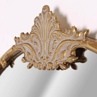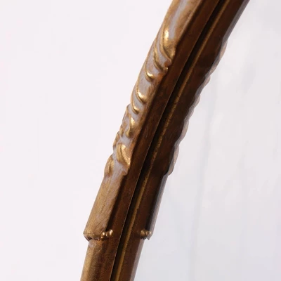 Crafted from a sturdy yet lightweight metal, this luxurious gold circular mirror with its ornate antique flourishes resembles the decorative mirrors of past centuries when maximalism was at the helm of high fashion. Embellish the wall above a mantle or in a master bedroom to create a gripping focal point in your space with this large 30″ x 32″ classically designed mirror.