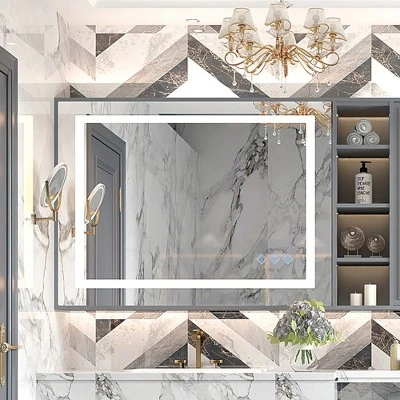 - –Dimmable: The brightness of this modern led mirror is dimmable, touch the light button for 1 second to turn the mirror light on/off. Touch the light button for 3 seconds to adjust the brightness of the mirror (10%-100%).
