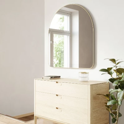 Hubba Arched brings a unique arch shape to the standard mirror. Featuring soft curves and a thin metallic finish rim, use Hubba in your entryway, bedroom or other living spaces to add a decorative touch, while instantly brightening your space. Measuring, 34 x 36 inches, this statement mirror can be leaned up against your mantle or mounted with included hardware.