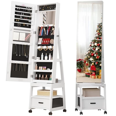 Organize, style, and secure your collection with this 360° swivel jewelry armoire. Standing 66″ tall, it’s a 4-in-1 design that combines a full-length mirror, lockable jewelry cabinet, makeup vanity, and rear storage shelves. Inside, you’ll find space for 108 earrings, 30 rings, 24 necklaces, 3 bracelets, plus makeup holders, lipstick slots, skincare shelves, and a bottom drawer. The HD explosion-proof mirror provides a safe, clear reflection, while the rotating base and lockable wheels ensure easy mobility and access. Finished in elegant matte white with velvet lining, this pre-assembled armoire blends beauty, safety, and functionality in one timeless piece.