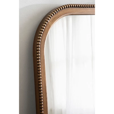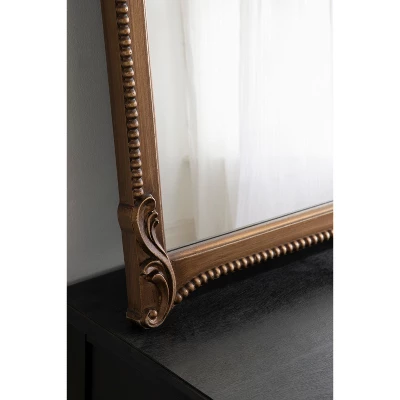 - Ornate Frame: This elegant wall mirror features an ornate, baroque-inspired frame with an ornamental crown and beading details cascading down the sides of the antique gold frame