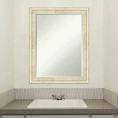 Give your bathroom the finishing touch with this 100% real wood Petite Bevel bathroom mirror. The Country White Wash frame is cream-colored with a distressed, weathered finish.. The frame is 2.5 in. wide and stands 1 in. off the wall. It’s Individually made using traditional custom framing techniques, it has the quality you expect from your local frame shop. It holds its value with premium finishing that can be appreciated up close. Because of our attention to detail and focus on artistry, architects, interior designers, and homeowners alike choose this mirror to create beautiful living spaces.