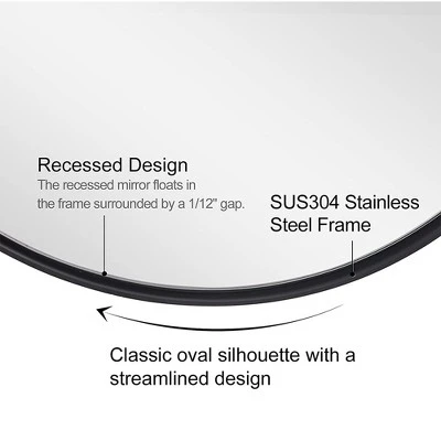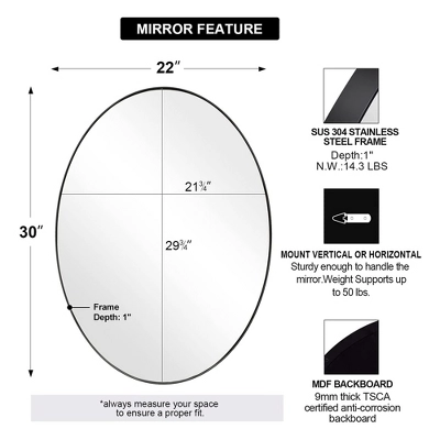 Start the day off with a mirror that matches your style. Enhance the modernity of your household with the ANDY STAR 22 x 30-Inch Oval Wall Hanging Bathroom Mirror.This oval-shaped mirror is sure to bring a sophisticated accent to any living area. Quality is in the details, from a refined matte black finish, precise linework, and the gap between the frame and glass. This mirror presents beautifully under high-definition floating glass and medium-density fiberboard with no visual distortion. A broad oval shape offers increased vertical visibility so you can get an unobscured look at your reflection before the day begins. The heavy-duty, 2-millimeter stainless steel frame with multiple layers of waterproofing allows for a luxury appearance boasting long-lasting durability. This modern hanging mirror is rated for use in the bathroom, fireplace, entryway, living room, and other high-moisture areas.For all-in-1 convenience, all mounting hardware for installation is included. Perfect for refining you or your household’s aesthetic, the ANDY STAR Oval Wall Hanging Bathroom Mirror is the high-end mirror you need to reinvent your daily routine.