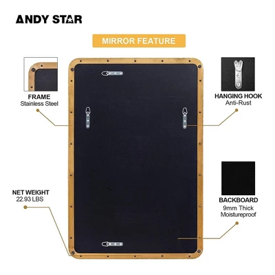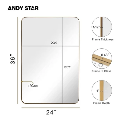 Start the day off with a mirror that matches your style. Enhance the modernity of your household with the ANDY STAR 24 x 36-Inch Rectangular Deep Metal Frame Hanging Mirror.This rectangular mirror is sure to bring a sophisticated accent to any living area. Quality is in the details, from a refined gold finish, precise linework, and the gap between the frame and glass. This mirror presents beautifully under high-definition floating glass and medium-density fiberboard with no visual distortion. A broad rectangular shape with rounded corners offers increased vertical visibility so you can get an unobscured look at your reflection before the day begins. The heavy-duty, 2-millimeter by 2-inch stainless steel frame with multiple layers of waterproofing allows for a luxury appearance boasting long-lasting durability. This modern hanging mirror is rated for use in the bathroom, fireplace, entryway, living room, and other high-moisture areas.For all-in-1 convenience, all mounting hardware for installation is included. Perfect for refining you or your household’s aesthetic, the ANDY STAR 24 x 36-Inch Rectangular Deep Metal Frame Hanging Mirror is the high-end mirror you need to reinvent your daily routine.