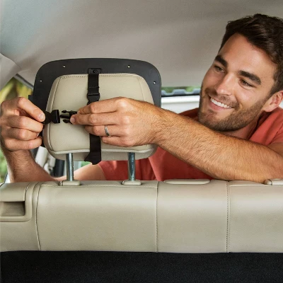 - Sturdy dual straps made of seatbelt material buckle onto adjustable headrests for secure attachment, Note: Mirror is compatible with adjustable headrests, but not with fixed headrests