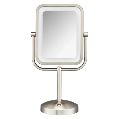 Manage your magnification with the Conair® Reflections mirror that features an easy-to-position double-sided frame with a flip. The 8-inch oblong mirror goes from 1x magnification to 8x magnification and can be rotated 360° for a custom view at any angle. Mounted on a swivel display with a no-slip, no-tip weighted base, the mirror is illuminated with lifetime LED bulbs that never need to be replaced. Choose from 3 light settings (low, medium, and high) to customize the light depending on your location, time of day, and beauty needs. The brushed nickel finish gives this must-have mirror a sleek, modern look that complements any vanity. Use 1x magnification for a full-face view when applying makeup or doing everyday beauty checks. Switch to 8x magnification for close-up work like tweezing or detailed makeup application. This cord-free mirror runs on 3 AA batteries (not included) and provides natural lighting modes and intensity-level settings that make it easy to create the perfect hair and makeup for any occasion. Experience energy-efficient, adjustable LED lighting for flawless, fuss-free makeup application and grooming with the versatile and stylishly designed mirror that combines innovation and precision.