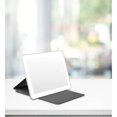 Show up for your glow-up with the tablet-style mirror that has touchscreen LED lighting, a detachable 5x spot mirror, a rechargeable battery, and a fold-up design for easy, on-the-go wireless grooming anytime, anywhere. With a modern design inspired by the latest digital technology, this innovative mirror is lit with lifetime bulbs that won’t dim or die and never need to be replaced. Three light settings—low, medium, and high—change with touchscreen ease. A simple tap on the screen changes the ambient, energy-efficient lighting. The long-lasting, rechargeable lithium battery keeps the lights shining for up to 4 hours before needing to be recharged with the 1.5M USB cable that comes included. Wireless technology ensures you can use the mirror just about anywhere and keeps you from being tethered to a wall plug or scrambling for a cord. The mirror makes it completely convenient to work on your makeup and hair on the couch, at the airport, at your beauty table, or wherever you need to style yourself. For precision, close-up viewing that eases eyestrain during detailed work like lash application, brow tweezing, or putting in contacts, zoom in with the compact 5x spot mirror. Adhered to the mirror’s surface, the small mirror maximizes your magnification and detaches for handheld close-ups or tossing in a makeup bag for on-the-go use. Lightweight with a slender profile and a white matte plastic finish, the mirror has a durable black cover with a modern look designed to protect it when closed and convert to an adjustable stand when opened. Use the cover to stand the mirror up at various angles and swivel the mirror to change its position from vertical to horizontal and capture your glowing reflection at the ideal angle. It goes where you go with long-lasting ambient illumination that makes anywhere grooming a bright possibility. Easy to pack. Easy to charge. Easy to reveal your true beauty in natural, unfiltered light.