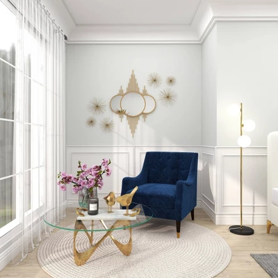 Apart from decorating your home, the purpose of this wall mirror is to bounce back outdoor light to a small room to make it look bigger. Pair this decorative wall mirror with house plants or other wall decor accent pieces to blend everything together perfectly. This round gold wall mirror showcases a finish and silhouette that suits both glam and natural-themed living room and dining interiors. This item ships in 1 carton. Can be hung vertically using the sawtooths on the back; nails and screws not included. Suitable for indoor use only. This item ships fully assembled in one piece. This is a single gold colored entryway mirror. Contemporary style.