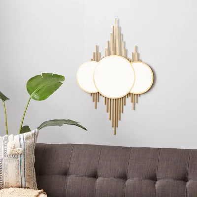 - •This unique round wall mirror features 3 overlapping round mirrors with a gold frame and a diamond-patterned exterior design