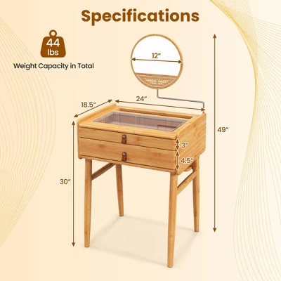This vanity table comes with a removable mirror. You can adjust the angle of the mirror while putting on your makeup. The tempered glass tabletop makes it easy to find the cosmetics and skincare products you need to use. 2 pull-out drawers and a large tabletop provide plenty of space to store and organize all your beauty products. Moreover, this bamboo dresser is sturdily constructed. Reinforced bars and non-slip foot pads ensure extra stability. Perfect for a small bedroom or checkroom, this space-saving vanity table maximizes functionality without sacrificing space. It is not only a practical choice for your beauty routine, but also an ideal gift for your friends and family.