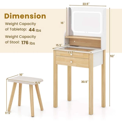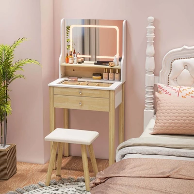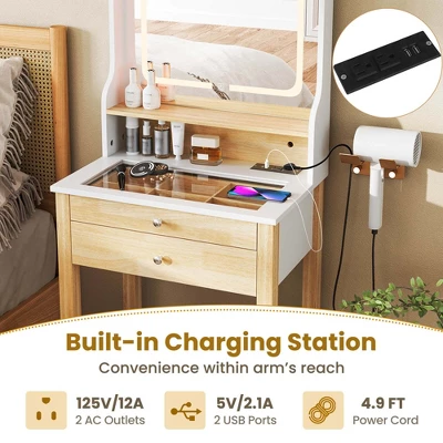 Featuring an open shelf and 2 drawers, this makeup desk meets various storage needs. The LED lighted mirror includes 3 color modes and adjustable brightness for personalized lighting. With a built-in charging station, you can conveniently charge devices while getting ready. The tempered glass tabletop allows easy jewelry selection and effortless cleaning. This stylish set also makes an ideal gift with its natural wood grain design, perfect for personal indulgence or special occasions.