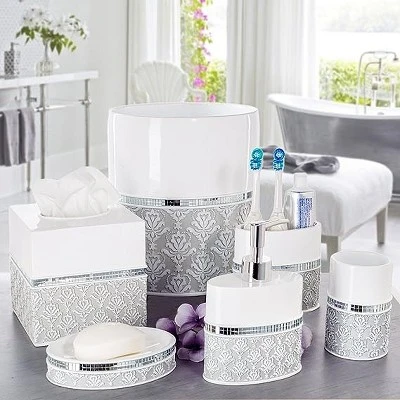 SPRUCE UP YOUR BATHROOM WITH AN EXQUISITE TOUCHDesigned to StunlOur Mirror Damask Bathroom Tumbler Cup is designed for those of discerning taste – anyonewho is all about treating themselves to the very best. We’ve combined elegant curves witheye-catching design to create accessories that will transform your bathroom into your very ownlittle spa. You’lll love the mix of enchanting glossy white, stunning mirrored accents, and texturedornate patterns set in grey that crown the Bathroom Tumbler Cup. Treat yourself or that loved one to these strikingBathroom Tumbler Cup and make every trip to the bathroom a seductive affair.All about Quality with thisBathroom Tumbler CupUnlike metal that easily rusts or regular plastic that quickly cracks, this Bathroom Tumbler Cup are madeusing high-grade resin that ensures maximum durability. All through the daily use and humid conditionsof your bathroom, these beautiful Bathroom Tumbler Cup will remain in eye-catching condition for years to come. Andwe’ve carefully sized the Bathroom Tumbler Cup to ensure it saves on valuable space while still exuding acaptivating presence. Experience a hard-to-find marriage between superior quality and great functionality.Here’s why you’ll love the Bathroom Tumbler Cup from the Mirror Damask collection:- Beautiful curves create a contemporary look to suit any bathroom.- Mix of white and grey beautifully blends into any color scheme.- Made using high-grade resin to ensure maximum durability.- Perfectly sized to fit even tight-spaced bathrooms.- Unique design makes it a great gift for both men and women.