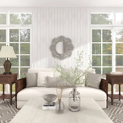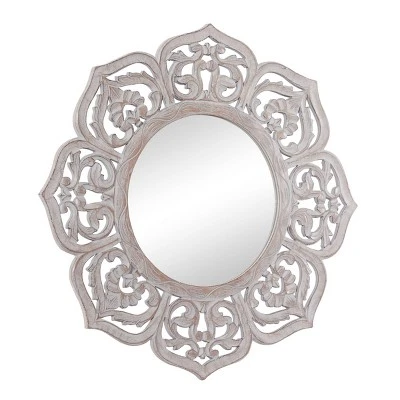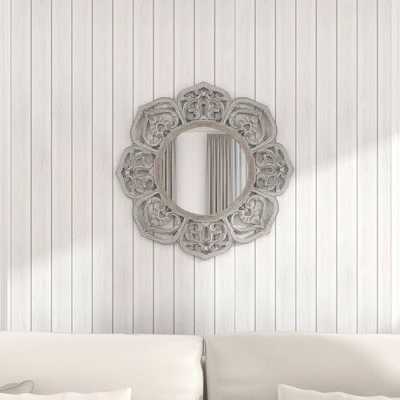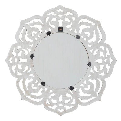 - •Delightfully elegant white wooden mirror for wall features an 8-petal flower design made of carved wood and showcases intricate scrollwork patterns