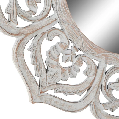 - •This floral wall mirror features a distressed white and brown wooden finish and a reflective glass mirror finish