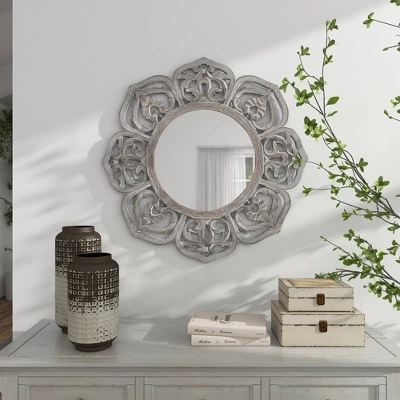 - •This decorative floral wall mirror features a round mirror shape and an 8-petal flower framing carved from solid wood