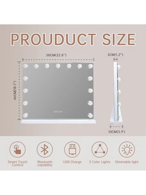- Product size: 18.1 X 22.8 inches. Smart touch control, bluetooth capability, USB charge, 3 color lights, dimmable light