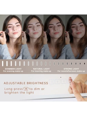 - Shimmer light for evening makeup. Natural light for morning makeup. Strong light for noon/afternoon makeup. Adjustable brightness – long press to dim or brighten the light.