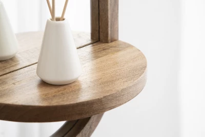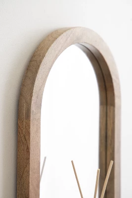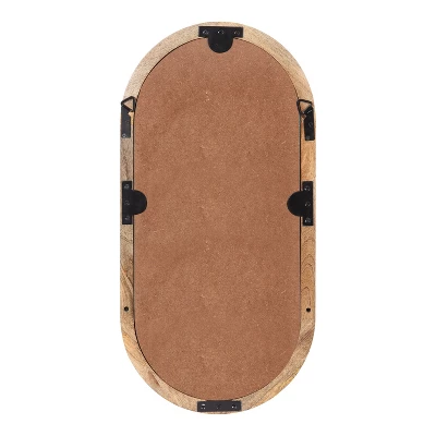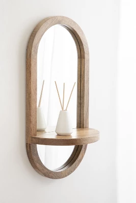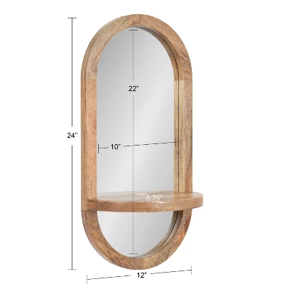 The perfect combination of stylish charm and functionality. This Hutton capsule shelf mirror is the best of both worlds. For a small bedroom or living room accent, the Hutton is the perfect choice. Its narrow profile and useful shelf allow it to fit smaller spaces while still having space for a few decor items or necessities. The overall dimensions of the mirror are 12 inches wide by 24 inches tall. This natural mango wood hue aligns naturally with a variety of design styles and color palettes. Crafted in India using premium materials, this mirror has unique wood variations meaning that each mirror will be a unique, one-of-a-kind piece. This mirror comes with D-Ring hangers on the back of the frame for quick and easy hanging.