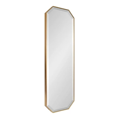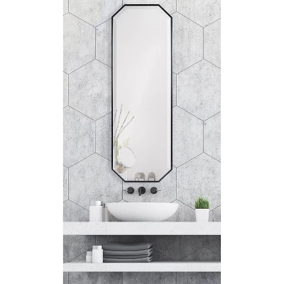 Indulge in the glamorous, minimal aesthetic of the Rhodes wall mirror, a practical wall accent for any room. Inspired by modern, geometric forms, the Rhodes mirror has minimal lines and a lovely octagon shape. The Rhodes surface is constructed with a resilient plastic frame and mirrored glass while offering a beveled edge to spread more light throughout the area. Adding a mirror to your wall expands your space by reflecting light, creating a more dimensional, open concept room. Hang this practical, geometric accent in any modern or glamorous living room, bedroom, entryway, bathroom, closet, or dining room. The overall dimensions of this mirror are 16.75 inches wide by 1.5 inches deep by 48.75 inches tall, showcasing a robust, full-length mirror for checking your appearance, tying your tie, or doing your makeup. Showcase the Rhodes on its own for a bold focal point or in multiples to create a grand wall display. The metal D-ring hangers attached to the back of the frame allow you to hang it both vertically or horizontally, depending on your unique decorative aesthetic.