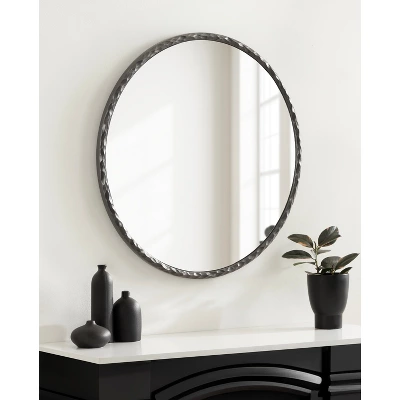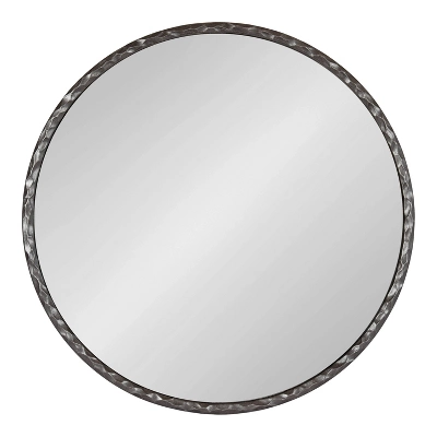 Enhance the modern aesthetic of your home by featuring the beautiful Jedda wall mirror in your home. Inspired by modern design and style, the Jedda mirror has a round shape with a unique textured edge, creating a fascinating visual piece with a modern presence. The classic shape of this beautiful mirror is complemented by the metallic gunmetal finish, making a bold statement on any wall throughout your home. The Jedda mirror is 26 inches in diameter, creating a striking accent that looks fabulous on any wall. Hang this beautiful piece of wall decor over your entryway console, above a living room mantel, or a bedroom dresser. If you’re looking to renovate your powder room or master bath, the Jedda mirror also looks excellent as a bathroom mirror above a vanity! Adding a playful and visually intriguing wall mirror highlights your style while enhancing the vibrancy and depth of your space, drawing in more light in darker areas. To hang the Jedda mirror, use the metal D-ring hangers attached to the back of the frame.