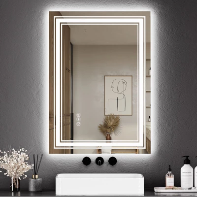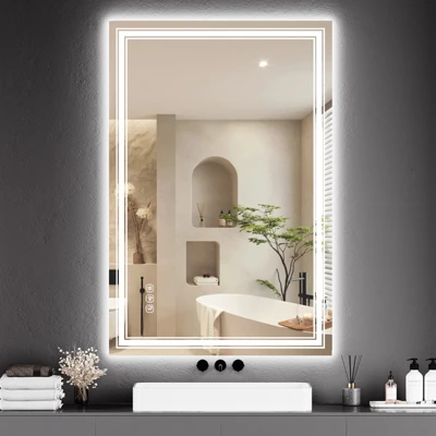 - [Infinitely Dimmable & Three Color Temperatures] Enjoy customizable lighting with this lighted bathroom mirror, allowing you to adjust the brightness to your liking. Simply press and hold the touch switch to dim the lights. You can choose among three color temperatures: warm light (3000K), natural light (4000K), and white light (6500K). Designed to be waterproof, this mirror is perfect for bathroom use.