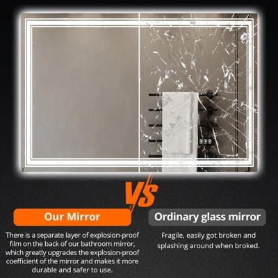 - [Safe and Durable Tempered Glass] Unlike standard mirrors, this LED bathroom mirror features 5MM tempered glass, providing enhanced strength, shatterproof qualities, and explosion resistance. Even if broken, it shatters into safe pieces rather than sharp fragments, ensuring a safer user experience.