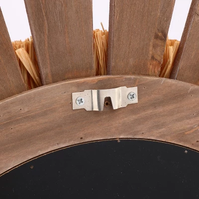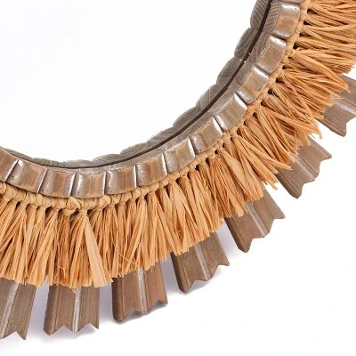 Create an extraordinary focal point on your walls with this boho style wall mirror. Striking and multi-dimensional, this wood and raffia wall mirror has a natural rustic feel from its with its solid wood arrow-like feather design and handcrafted raffia palm accents. The unique layered design of the mirror frame is what makes it stand apart from other wall mirrors, and is made to take center stage in any home or office type with a natural or boho theme. The 24-inch round wall mounted accent mirror will make a beautiful statement displayed above your sofa or console table, or in your dining room or bedroom. Due to the handcrafted nature of the frame, no two will be alike, and there will be slight differences in shape, size, and color.