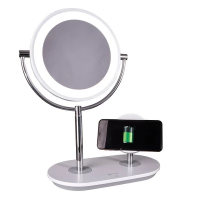 Watch tutorials, charge your phone, chat with friends – all while enjoying the crisp natural daylight illumination of OttLite’s ClearSun® LED technology. Recognized by Glamour Magazine as “Best for Magnification” in their best lighted makeup mirror article, the innovative OttLite Wireless Charging LED Makeup Mirror features an adjustable stand with integrated wireless charging. Simply place your Qi-compatible phone on the stand or charge phones and tablets with the 5V, 2.1A USB port. Plus, you can chat with friends while getting ready or watch your favorite beauty influencers teach you the latest techniques and trends while you try them out in the mirror. Select from three brightness settings and easily adjust and rotate both mirror and stand up to the angle you need. With the incredibly accurate ClearSun LED illumination, you’ll know you’re seeing skin tones and make up true to life. For tweezing and precise techniques, just rotate the mirror to reveal 5x magnification.