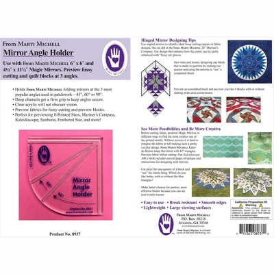 MARTI MICHELL-Folding Magic Mirror lets you be more creative! Preview all kinds of quilt blocks before cutting or sewing. This lightweight mirror is break resistant and has smooth edges, a larger viewing surface and is easy-to-use. It even comes with helpful instructions. Great for positioning fabric when making 8-pointed stars or other multi-sided designs. Magic Mirror measure is 6×6 inches. Made in USA. WARNING: This product can contains chemicals including Poly(methyl methacrylate), which is known to the State of California to cause cancer. For more information go to www.P65Warnings.ca.gov.