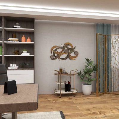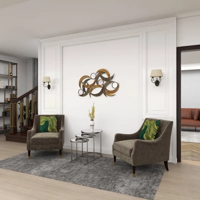 Our product can provide a great first impression on your contemporary style living rooms when displayed on light toned walls. This item ships in 1 carton. Designed with overlapping crescent moon bands with four round silver mirror accents. Can be hung horizontally or vertically using the keyholes on the back; nails and screws not included. Suitable for indoor use only. This item ships fully assembled in one piece. This is a single beige colored wall sculptures. Contemporary style.