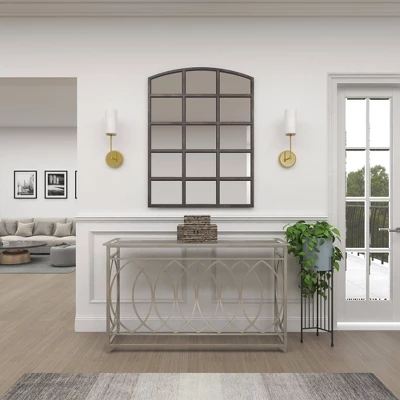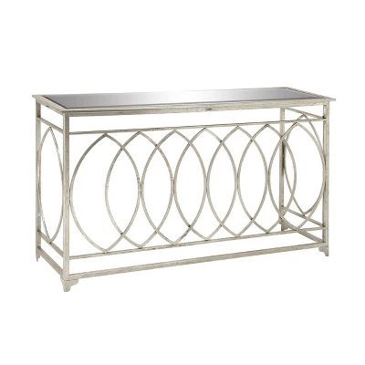 - •Metal silver console table has a rectangle mirror surface with oval metal structure in an open style frame