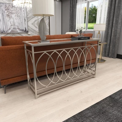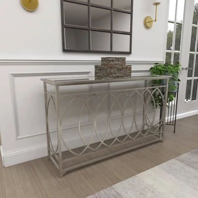 Bring a finishing touch to your home with an inviting appeal with this console table. A sturdy and long lasting construction for a years of enjoyment. Give your home a luxurious feel with this stunning silver metal with glass top side table that will compliment other sleek metal furniture and bold color background. This item ships in 1 carton. Suitable for indoor use only. Some assembly required. Maximum weight limit is 100 lbs. This is a single silver colored entryway table. Traditional style.