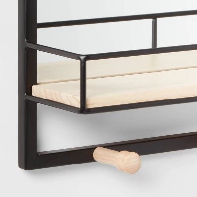 Make a functional addition to your home with the Wood Entryway Organizer with Mirror from Brightroom™. This large entryway organizer features a rectangular mirror with a built-in shelf and multiple hooks below it to provide enough space for your cosmetics, plants, towels and other items. The black frame complements the wooden shelf for an appealing look, and you can simply hang it along the entryway wall to add a beautiful look to the space.