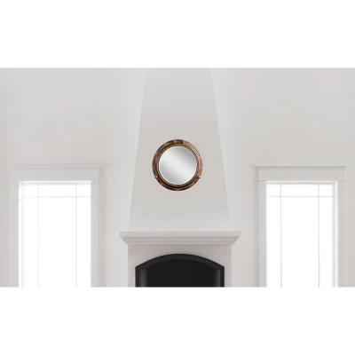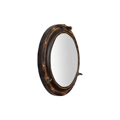 Inspired by windows from ships of a by-gone era, this handsome porthole wall mirror adorns any unused space in sophisticated style. Crafted from metal, this piece’s distressed details pair perfectly with rich faux-leather arm chairs and loveseats, while its round silhouette blends effortlessly into any casual or formal aesthetic. Play into this piece’s nautical flair by adding it to a seafaring living room ensemble, comprised of navy-and-white-stripe upholstered arm chairs accented with sailboat-pattern pillows. Use nearby walls to display ship wheel canvas prints and plank-inspired decor for an artful and cohesive display, then match it with metal typographic accents for a dash of unexpected style. With its nailhead details and brown color palette, this eye-catching wall mirror brings visual appeal to any corner of your space.
