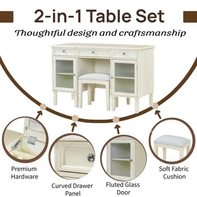 This 46.5-inch multifunctional desk is ingeniously designed with a hidden fold-down mirror in the middle layer. When the mirror is open, it transforms into a stylish dressing table; when closed, it seamlessly doubles as a spacious computer desk. The desk features a generous workspace, small storage compartments in the middle, two side drawers, and two glass-door cabinets, providing ample hierarchical storage to meet all your needs for cosmetics and office supplies. Made from high-quality, eco-friendly MDF material, the desk offers durability and stability, with solid wood legs for the table and stool. The curved corners of the desktop, simple drawer stripes, and elegant white oak finish add a touch of bright luster to any bedroom, regardless of its decor style. Whether you’re looking for a versatile piece of furniture for your home office or a chic addition to your dressing area, this desk is a perfect choice for both functionality and style!