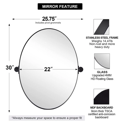Start the day off with a mirror that matches your style. Enhance the modernity of your household with the Moon Mirror Modern 22 x 30 Inch Oval Wall Mounted Vanity Mirror.This oval-shaped mirror is sure to bring a sophisticated accent to any living area. Quality is in the details, from a refined matte black finish to precise linework. Enjoy the elegant design with the gap between the frame and glass. A broad oval shape offers increased vertical visibility so you can get an unobscured look at your reflection before the day begins. This mirror is suspended with adjustable rotating clamps for you to tilt and pivot the mirror to view yourself from multiple angles. This modern hanging mirror is rated for use in the bathroom, fireplace, entryway, living room, and bedrooms.For all-in-1 convenience, all mounting hardware for installation is included. Perfect for refining your household’s aesthetic, the Moon Mirror Modern 22 x 30 Inch Oval Wall Mounted Vanity Mirror is the high-end mirror you need to reinvent your daily routine.