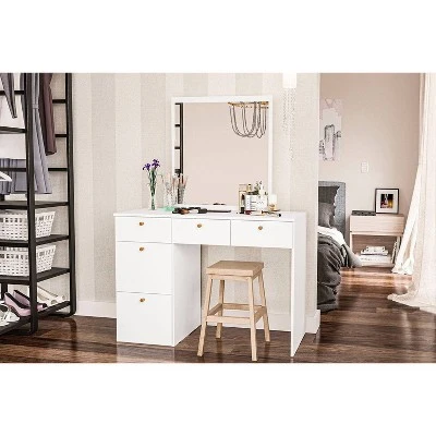 The Nevada Vanity has all white finish with a resistant melamine coating and wooden handles. This vanity includes a tall mirror and spacious table top. It offers tons of storage options with 3 small drawers, 1 larger drawer and storage cabinet. The Nevada Vanity will keep all your items organized and tidy while adding a modern touch to any room.