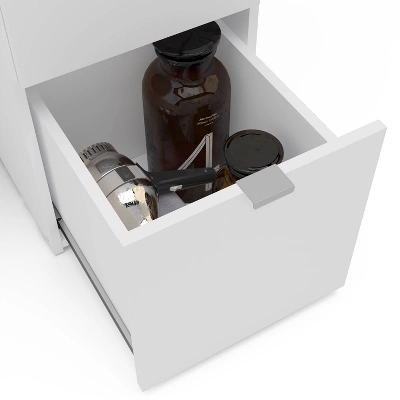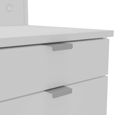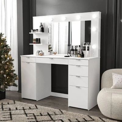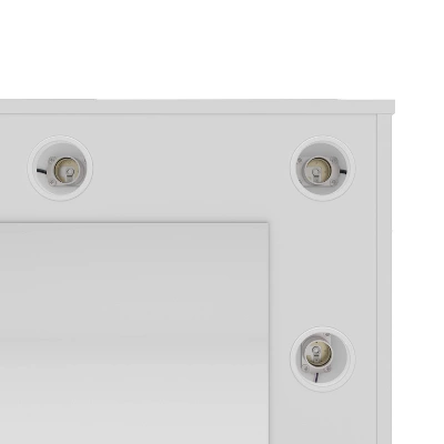The Olivia Makeup Vanity with Lighted Mirror from Polifurniture is a perfect addition to any room with its white finish, modern design and ample storage space. This vanity features 6 storage drawers in various sizes to keep all your comestics and personal belongings neat and organized. The large bottom drawer and spacious storage cabinet are perfect for taller items while the two open shelves can be used for extra storage or display space. The large lighted mirror and spacious table top provide the perfect place to get ready for the day or a fun night out. Constructed from engineered wood with a resistant and durable melamine finish this vanity was designed to last. The white finish and modern aluminum handles will fit perfectly with any current home décor. The Olivia Makeup Vanity Table will add a modern touch to any bedroom while also keeping your items neat and organized with its multiple storage option.