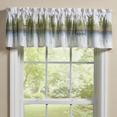 Capture the still, serene atmosphere of lake life with this nature patterned valance curtain. Features a foggy forest landscape of a scenic reflective lake view with two fishermen in a canoe lined by towering pine trees. Unlined with cotton fabric to provide a soft filter to harsh outdoor lighting, inviting natural warmth into your home without overwhelming your space. Accented by delicate ruffling at the top to offer a timeless look without having to redecorate an entire room that can be used by itself or paired with your favorite tier curtain for a dynamic display. This rustic outdoorsy window topper can be used time and time again in your favorite farmhouse, country, lodge, lake house, primitive, cabin home decor, and more.