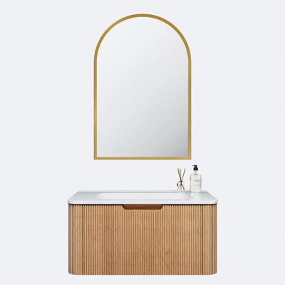 This combined set pairs a 30-inch wall-mounted bathroom vanity with an aluminum alloy thin-edge right-angle arch gold wall mirror, ideal for modern bathrooms.It features a durable ceramic basin and a soft-close drawer, balancing practicality and user-friendly design.The floating vanity saves space and resists moisture, while the gold mirror adds elegance and the curved edges enhance safety.